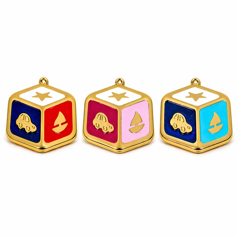 Μεταλλικό charm σε σχήμα ζαριού με σμάλτο σε χαρούμενους χρωματισμούς και παιδικά μοτίβα.