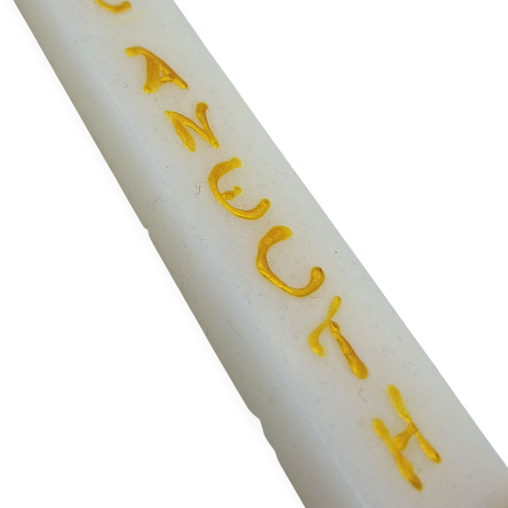 Χειροποίητη αρωματική πασχαλινή λαμπάδα με τη φράση «Χριστός Ανέστη», διακοσμημένη με χρυσά γράμματα σε λιτό και κομψό ύφος.